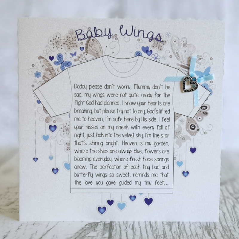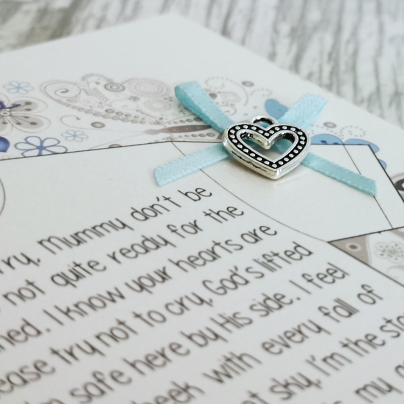 Sentimental Greeting Card to comfort those who may have suffered miscarriage, still birth or infant loss, printed on pearlescent card with ribbon bow and heart charm.