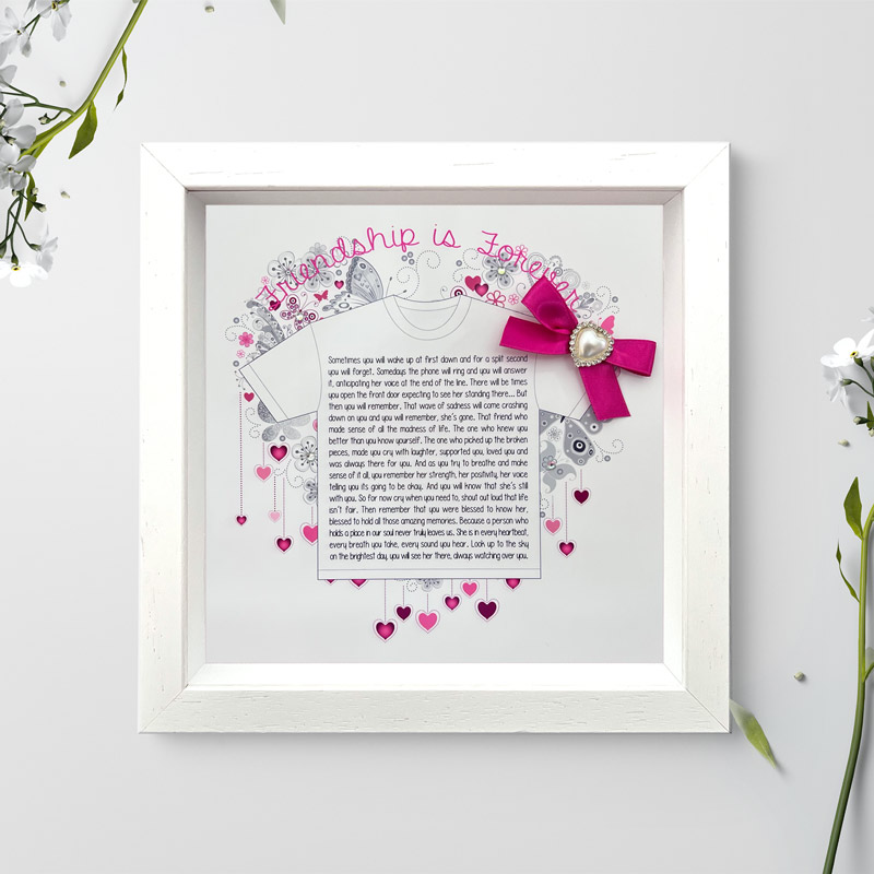 Sentimental Printed Frame suitable to comfort those who may have lost a female friend. High Quality print with satin ribbon bow and heart shaped pearl diamante embellishment presented in a wooden frame that is handmade in Ireland.
