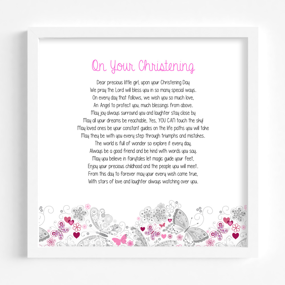 Sentimental Printed Frame suitable for a child’s Christening. Our most popular verses are now available in this alternative design in a white MDF frame.