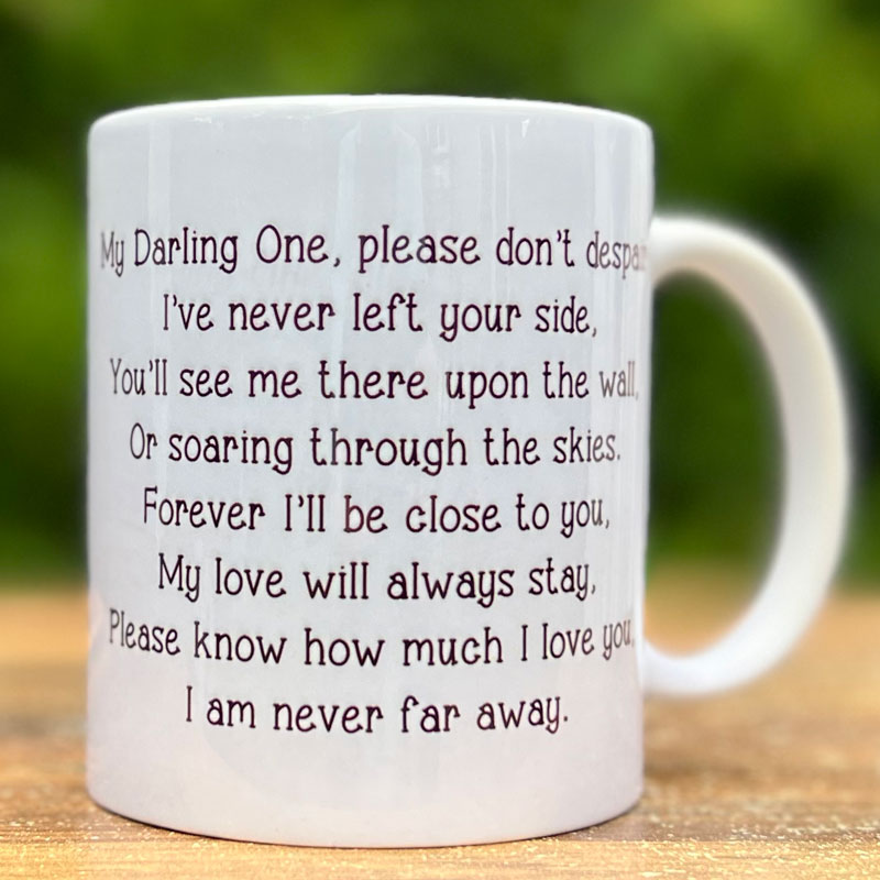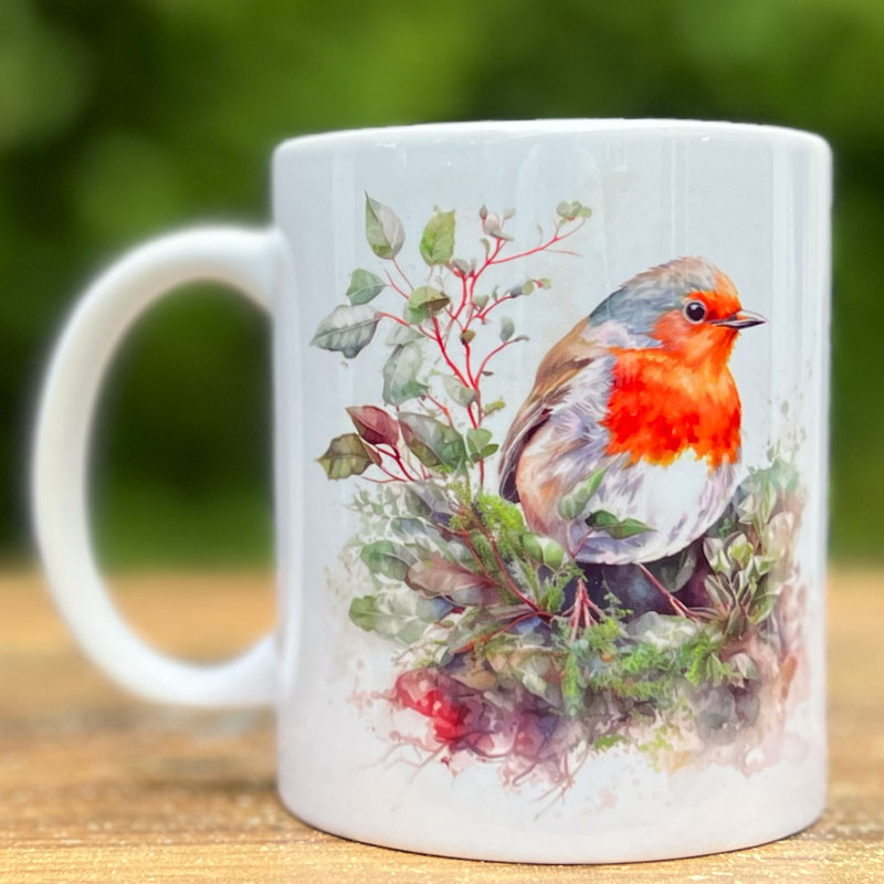 This mug features an image of a robin on one side and a verse on the opposite side.