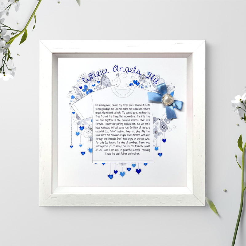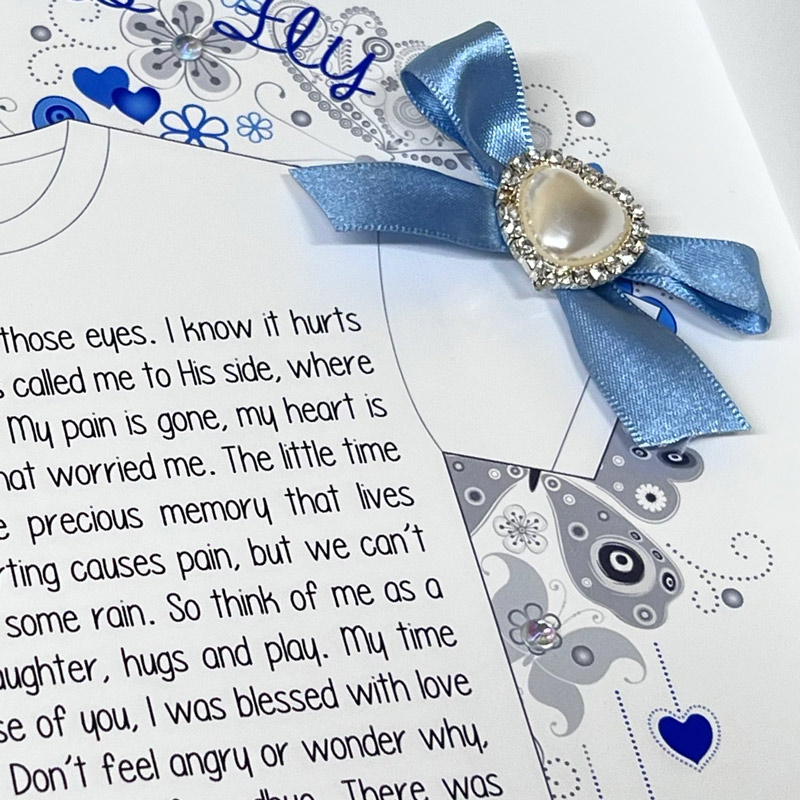 Sentimental Framed Gift to comfort those who may have suffered the loss of a child. High Quality print with satin ribbon bow and heart shaped pearl diamante embellishment presented in a wooden frame that is handmade in Ireland.